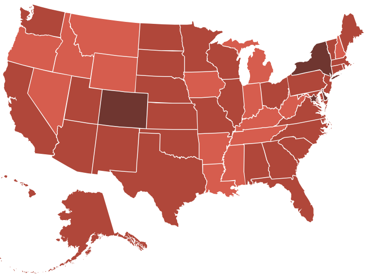 For this particular implementation of a color map, I wanted the color of the state to be dependent on a location quotient value. The function will take in a dictionary of US states names and corresponding location quotients as Doubles. It switches on ranges of location quotients, the same ranges found on the BLS graphs (see above). Within the .performUpdates method, for each set range, the setColor.forStateName will change the color of the state to be a different shade of red.