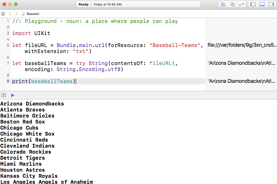 let baseballTeams = try String(contentsOf: fileURL!, encoding: String.Encoding.utf8)